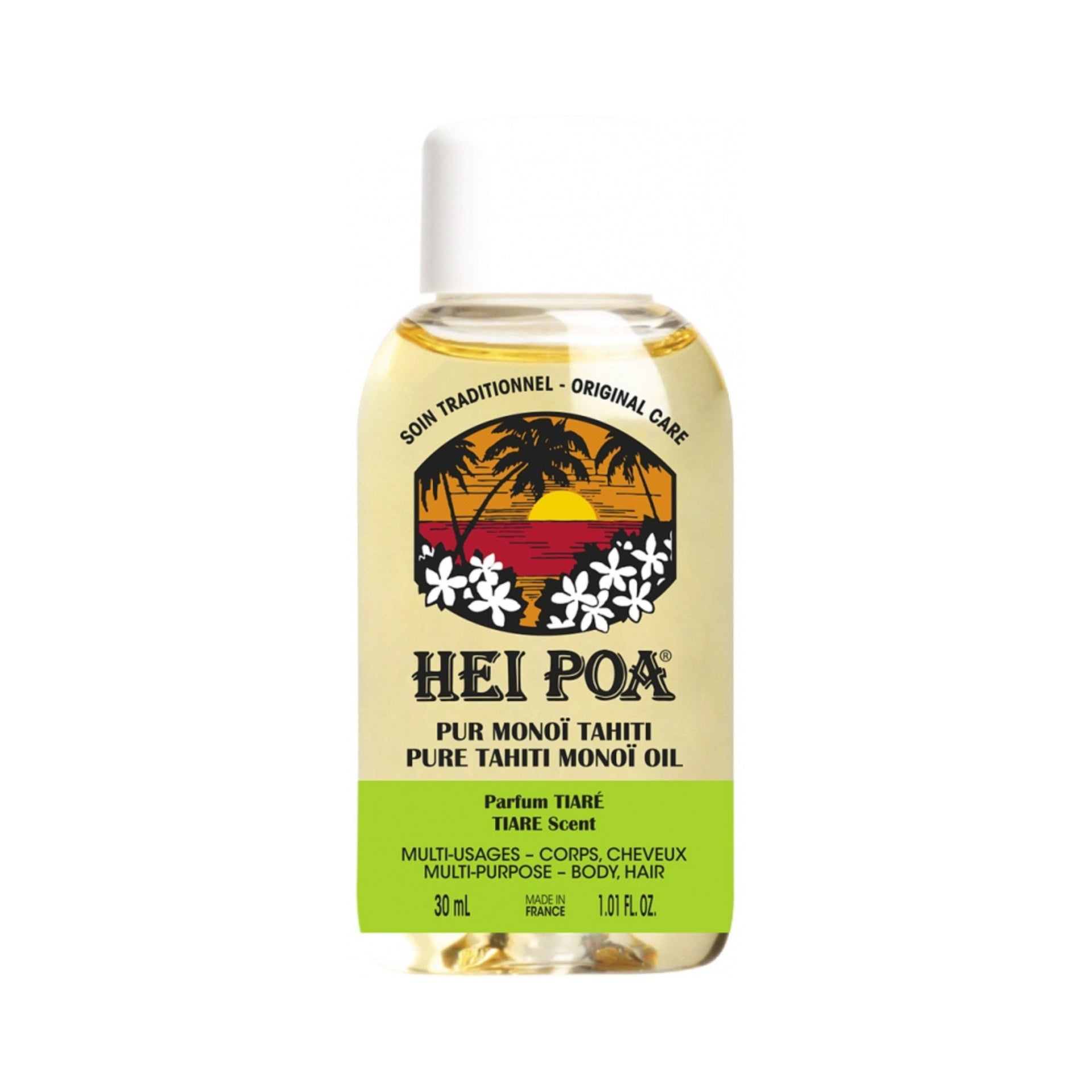 Rediscover the essence of Polynesia with the original Monoi Oil encapsulated in a this Iconic Bottle by its evocative sunset and dreamy scent.