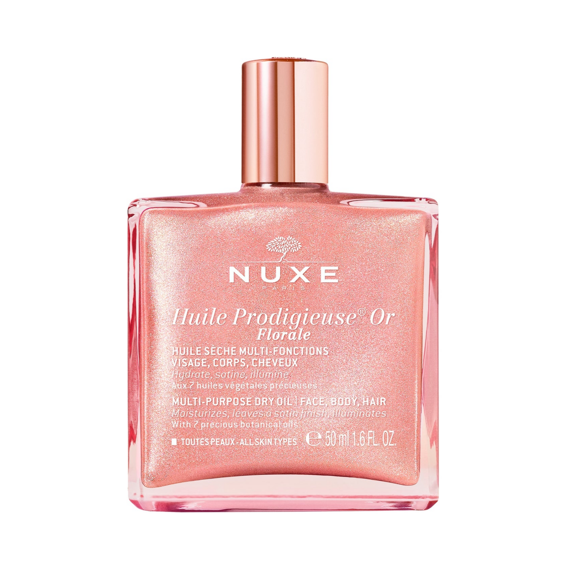 This glittery dry oil with pearls of natural origin offers an irresistible iridescent rose gold glow to all skin types and all skin tones. It enhances and illuminates the skin, making it soft and silky without a greasy finish thanks to its inimitable dry-touch texture. Its fragrance with floral and joyful notes will delight your senses with sparkling and luminous waves.