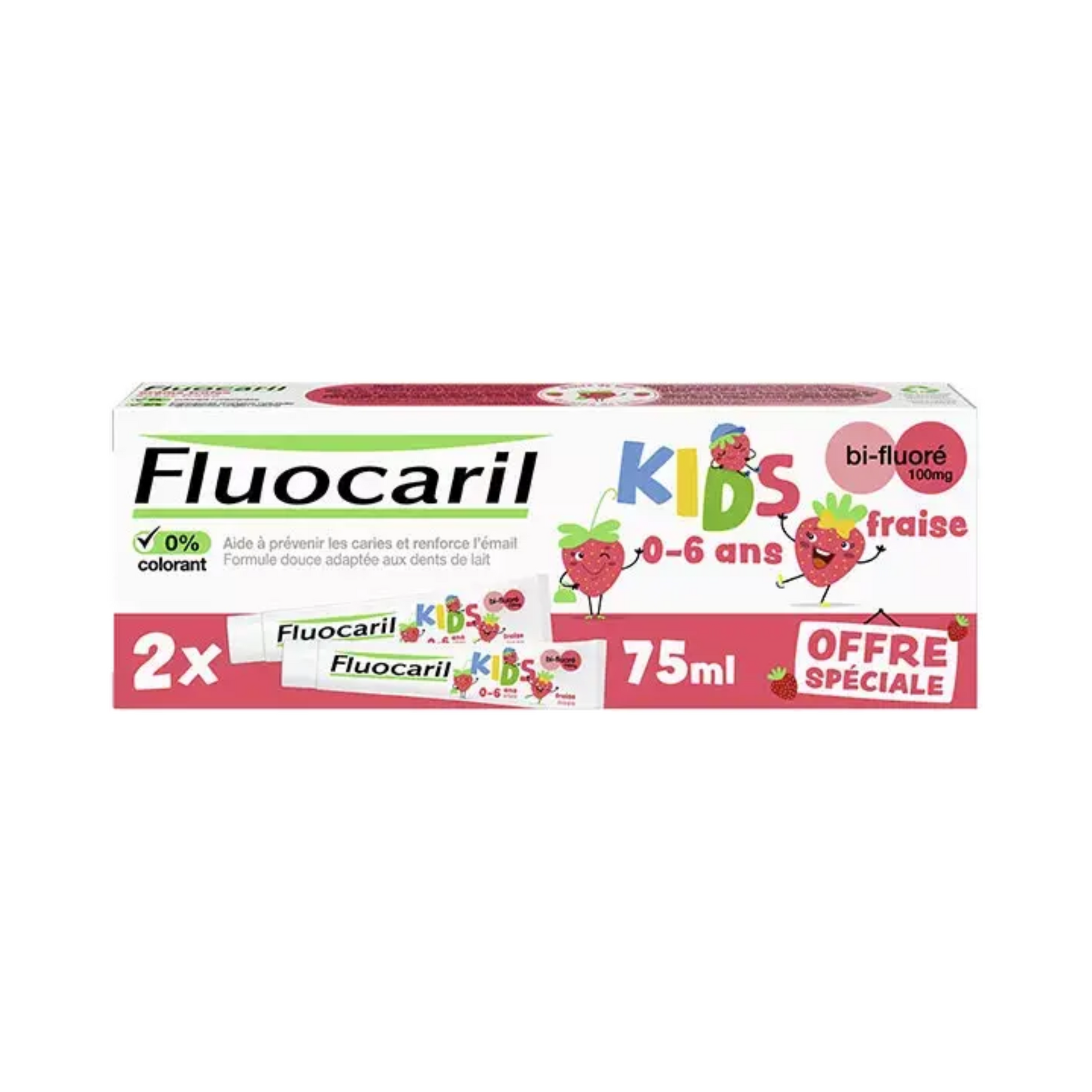 Fluocaril Kids Toothpaste Bi-Fluoré 0-6 Ans Lot de 2 x 75 ml is a toothpaste with a gentle formula, developed for milk teeth which have thinner enamel than adults.