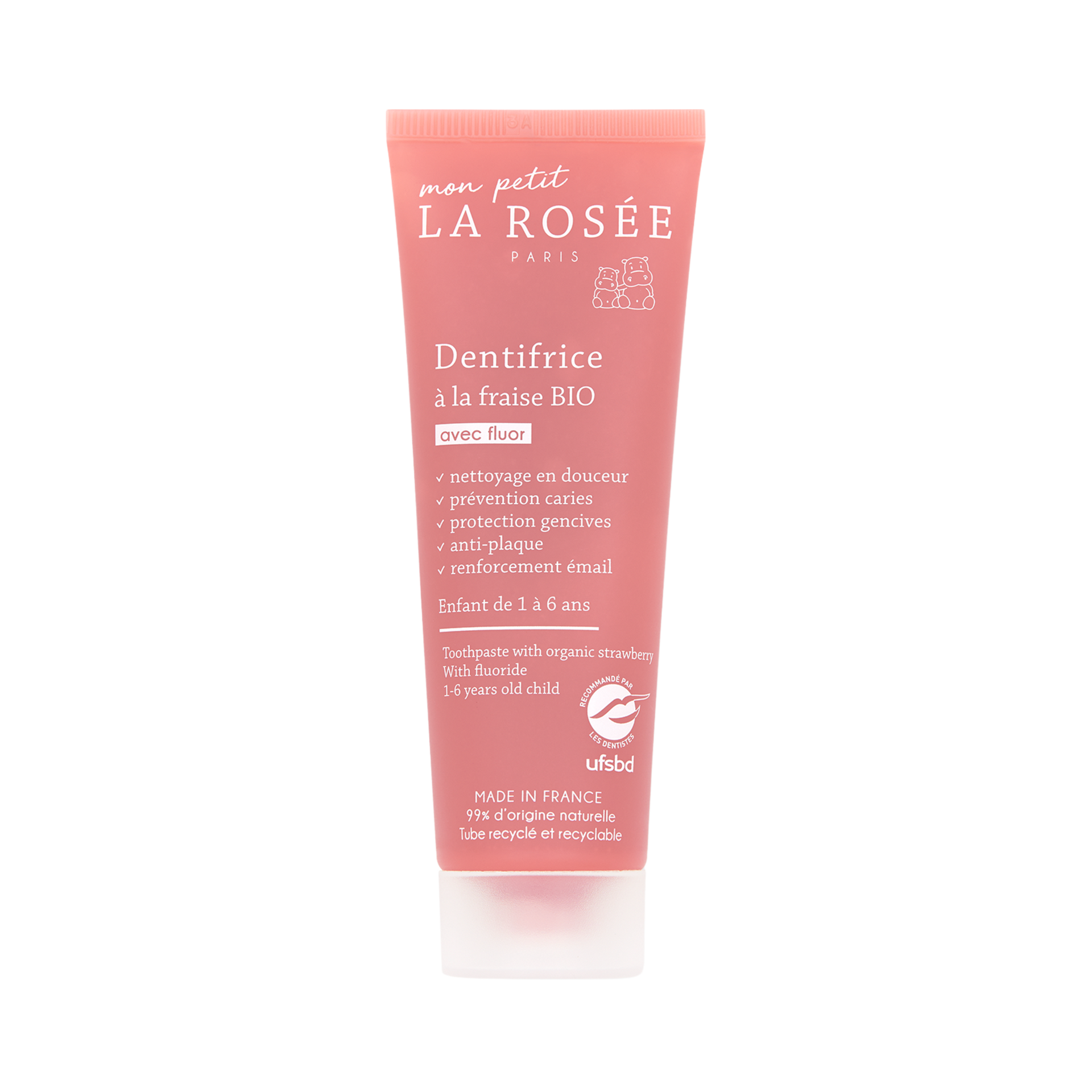 In accordance with the recommendations of the French Union for Oral Health (UFSBD) for children from 1 to 6 years old, La Rosée toothpaste contains fluoride (1000 ppm) which provides effective protection against cavities.
