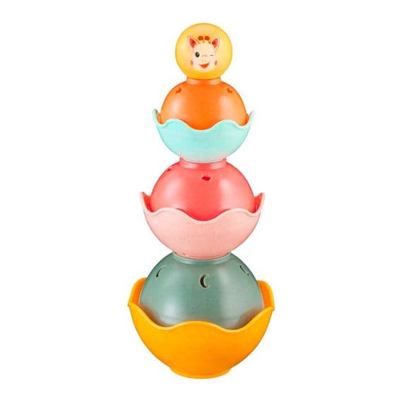 6 colourful stacking bowls forming a pretty pyramid decorated with a sound ball with the effigy of Sophie la girafe.