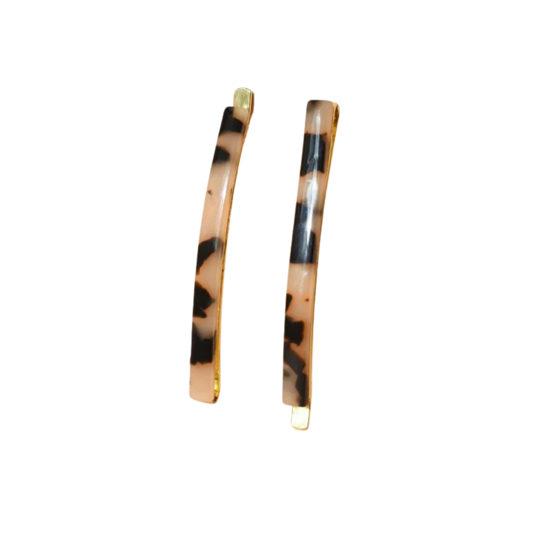 A refined duo of tortoiseshell-effect hairpins handmade from durable cellulose acetate. Both practical and elegant, they secure hair comfortably without damaging the fibre. Their timeless design captures the light, enhancing every hair colour and adding a chic finishing touch to your hairstyle.