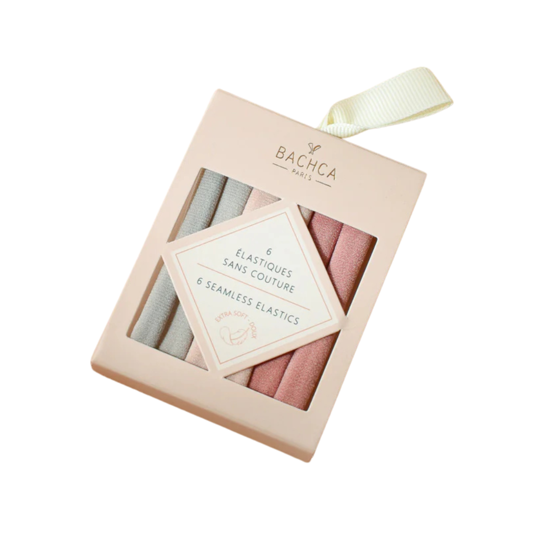 A set of 6 seamless pink hair elastics, handmade without metal parts to ensure a gentle hold without breakage. Both practical and stylish, they are perfect for everyday hairstyles, from ponytails and buns to braids, adding a subtle pop of colour while being soft on the hair fibre.