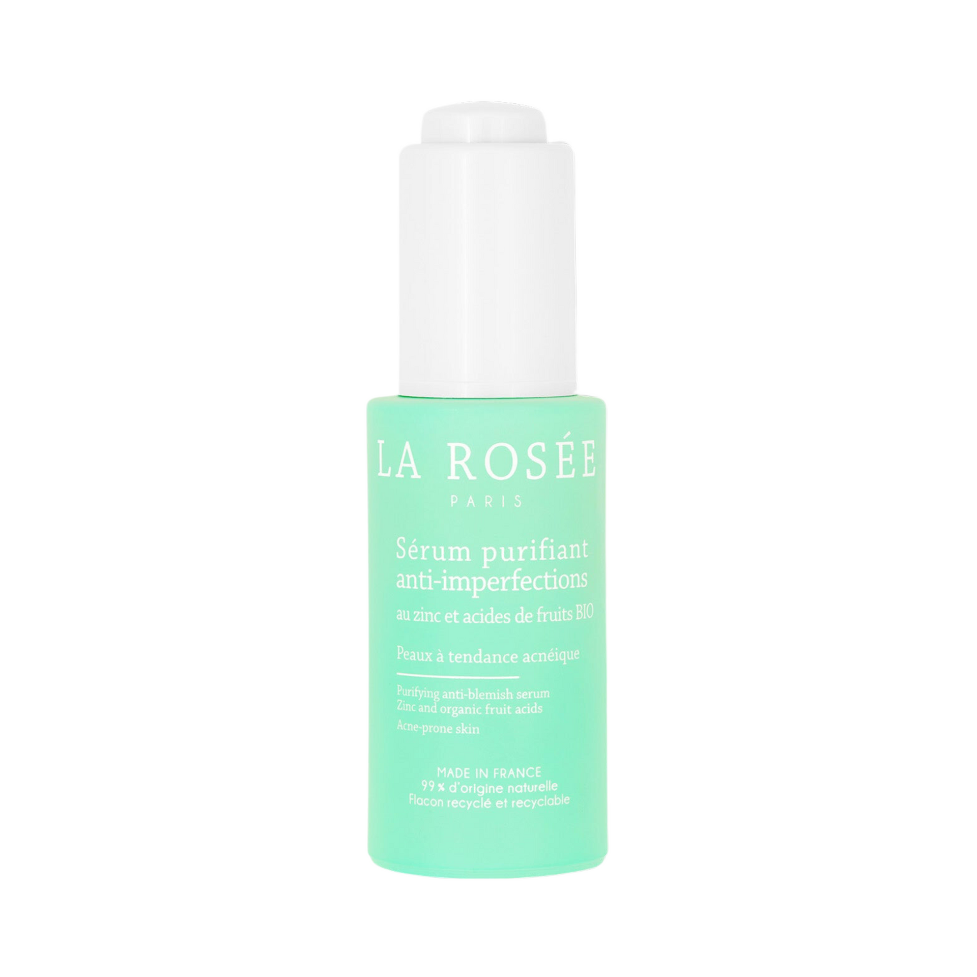 La Rosée Purifying Anti-Blemish Serum with zinc and organic fruit acids reduces excess sebum, unclogs and tightens pores, and gently exfoliates for a refined and smooth skin texture.