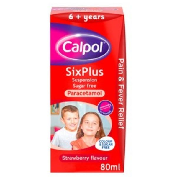 Calpol Six Plus Sugar Free Suspension 80ml brings down high temperatures (also called fever) and relieves pain and is formulated as a sugar free suspension. The paracetamol in Calpol Six Plus Sugar Free Suspension is used to relieve pain and / or bring down fever (high temperature) in many conditions including cold and flu, headache, toothache, earache, post immunisation fever, sore throat and other aches and pains.