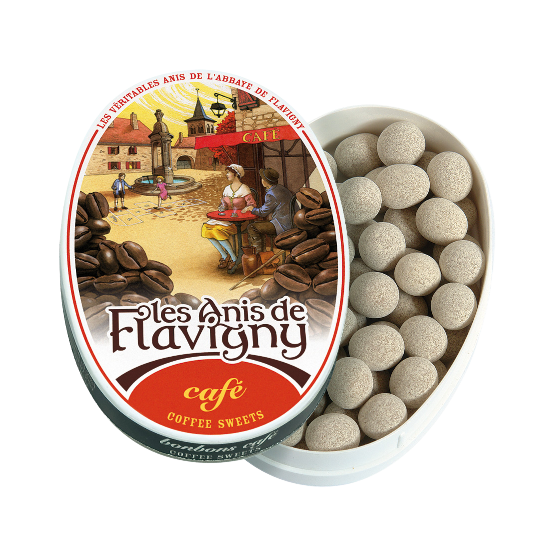 Sugar, a natural coffee flavor, a green anise seed (0.2%) in the heart of the candy.