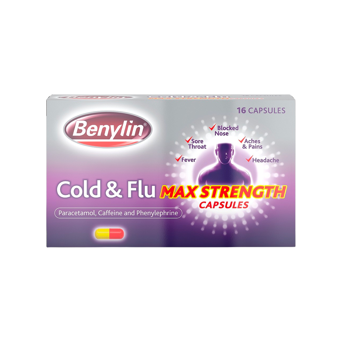 Benylin Cold and Flu Maximum Strength Capsules relieve the symptoms of colds and flu, including headache, fever, nasal congestion, sore throat, fatigue and drowsiness, aches and pains.