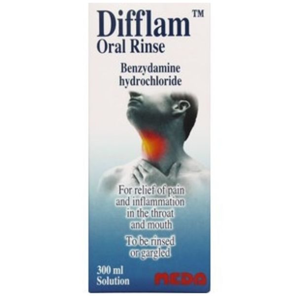 A locally acting analgesic and anti-inflammatory treatment for the mouth and throat; Difflam can be used in traumatic conditions such as tonsillectomy, use of naso-gastric tube or dental surgery, or inflammatory conditions such as pharyngitis, aphthous ulcers, and oral ulceration due to radiation therapy