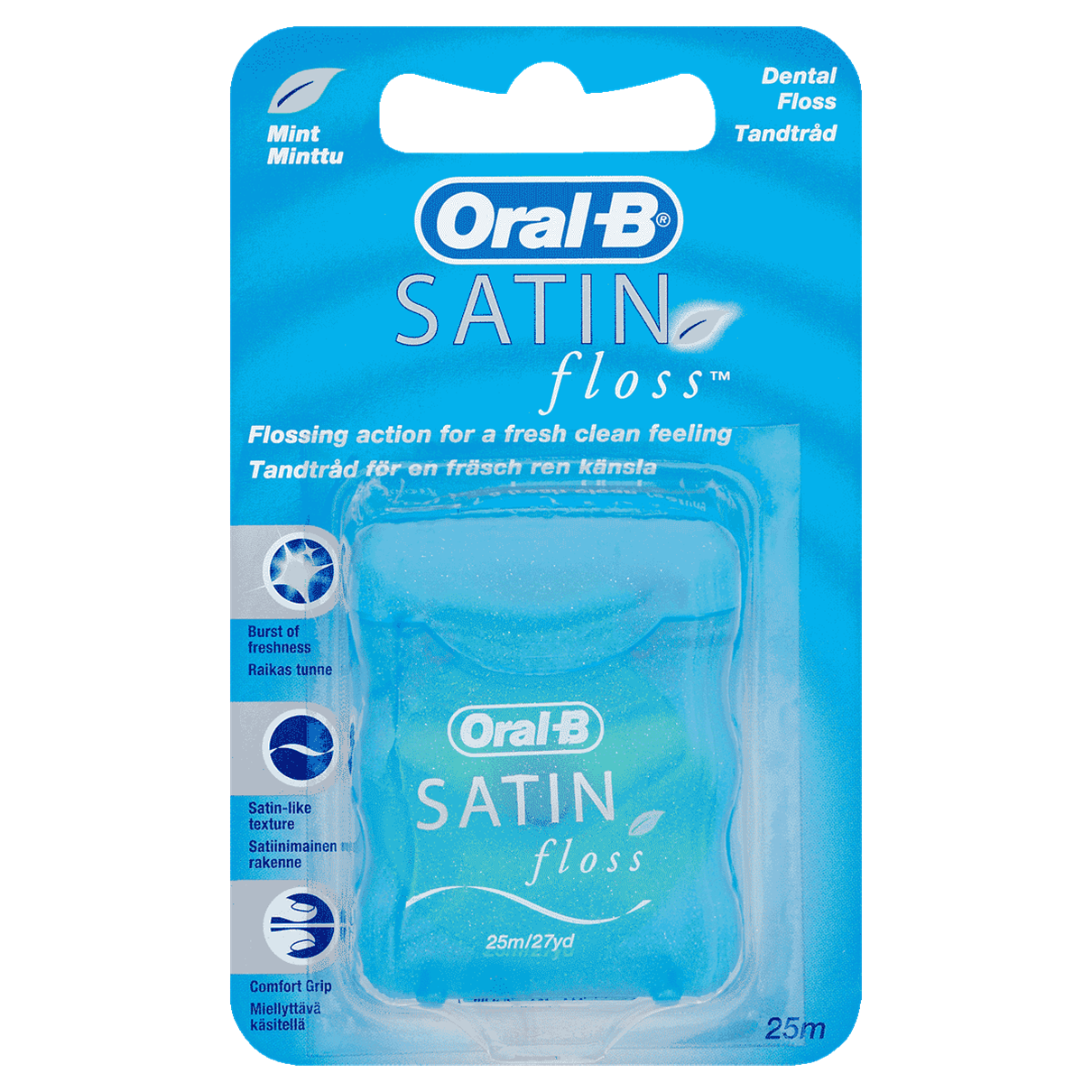 Oral-B Satin floss instantly feels different as it releases a burst of mint freshness on contact that lets you know it is working. Its unique satin-like texture is comfortable to handle. It effectively cleans out plaque and particles between your teeth and below the gumline, so your teeth feel squeaky clean. Daily flossing with Satin Floss you do more to keep your teeth and gums healthy.