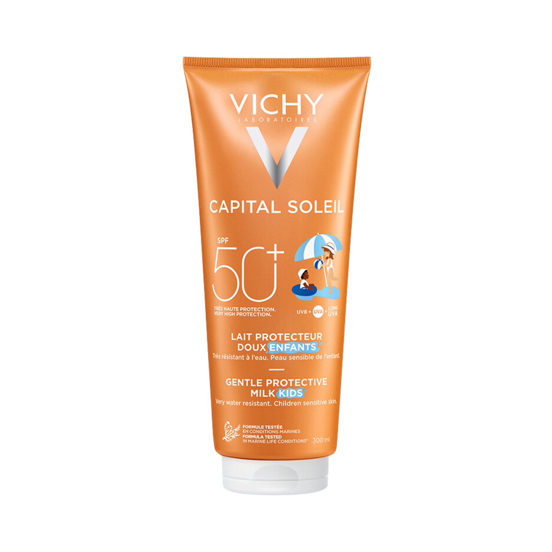 Protect young skin from UV rays with the Vichy Capital Soleil Gentle Protective Milk SPF50 for children. The lightweight, anti-white marks formula protects from the harmful effects of the sun’s UV rays, keeping skin optimally protected. Easy to apply, the gentle milk will hydrate skin upon application. The formula, enriched with Vichy Volcanic Water, for protection that cares for skin and defends in one-step. Suitable for children 6 months or older. No fragrance.