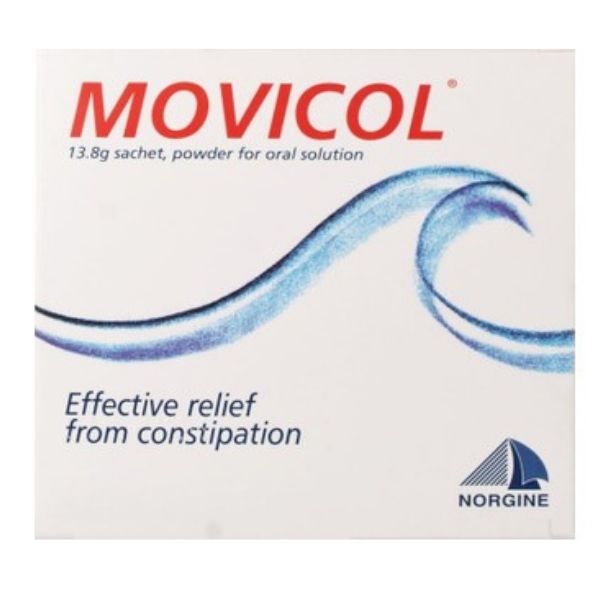 Containing macrogol (polyethylene glycol), which is a type of medicine known as an osmotic laxative, each Movicol sachet also contains sodium bicarbonate, sodium chloride and potassium chloride. The contents of the sachets should be mixed with water to make a drink. Macrogol is an inert substance that passes through the gut without being absorbed into the body. It relieves constipation because it causes the water it is taken with to be retained in the bowel instead of being absorbed into the body. This increases the water content and volume of the stools in the bowel making them softer and easier to pass.