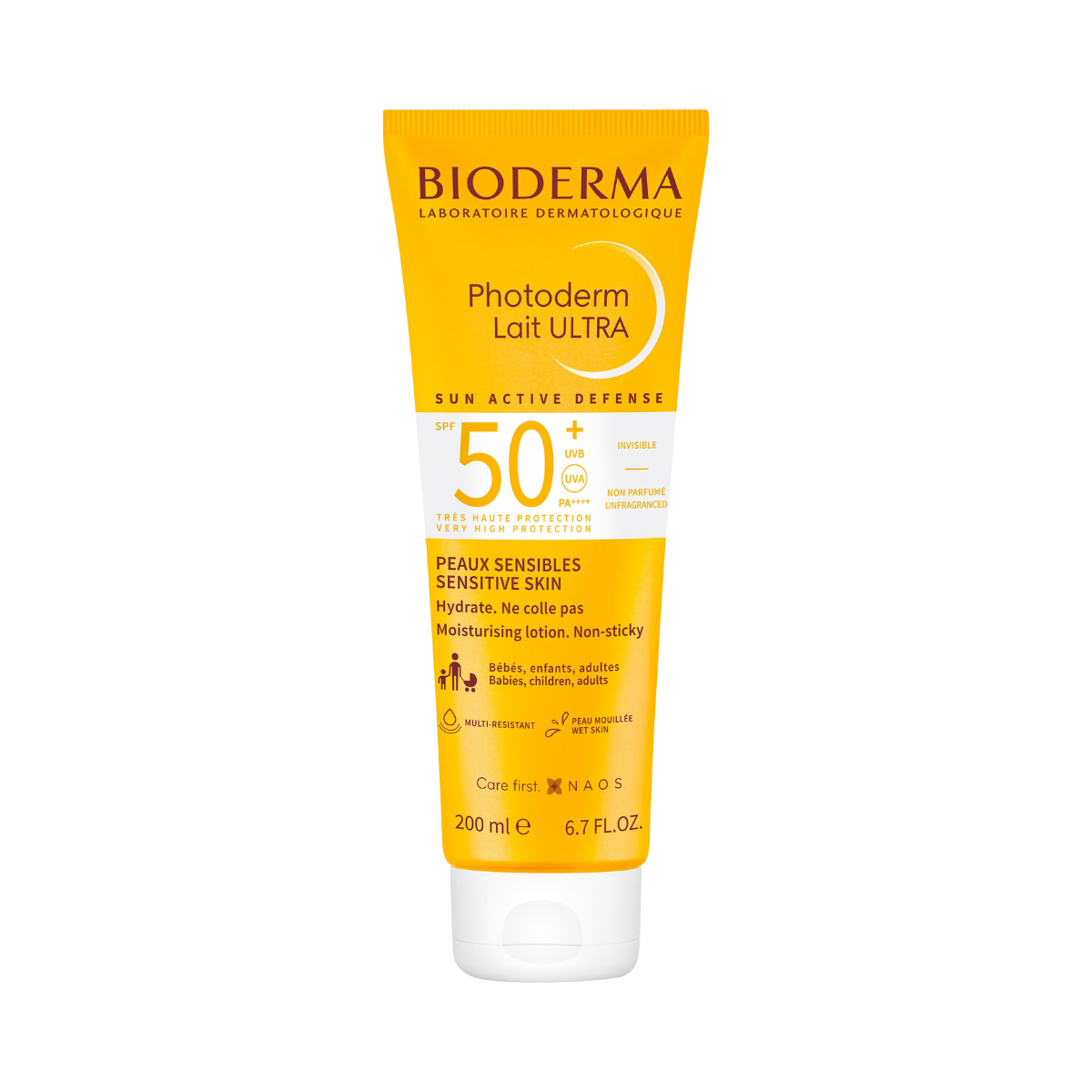 Bioderma Photoderm Lait Ultra SPF50+ sunscreen guarantees very high protection reinforced against UVA for sensitive skin even the most vulnerable. It's ultra-light and melting texture provides 8H hydration and an invisible finish. Suitable for the whole family.