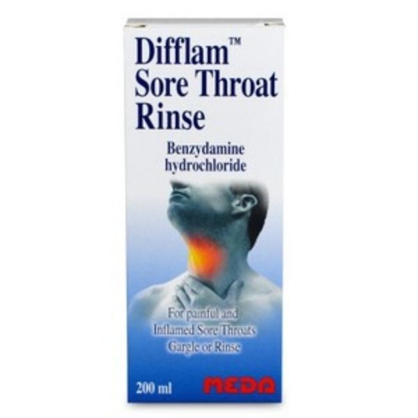 Difflam Sore Throat Rinse - Effectively reduces pain and inflammation in the throat. 200ml mouth rinse. Contains Benzydamine Hydrochloride For painful and inflamed sore throats. Gargle or rinse. Not suitable for use in children aged 12 years and under. Difflam Sore Throat Rinse is different to most other rinses on the market. Rather than numbing the pain with a anaesthetic, Difflam uses an anti-inflammatory drug similar to Ibuprofen to reduce the swelling and pain