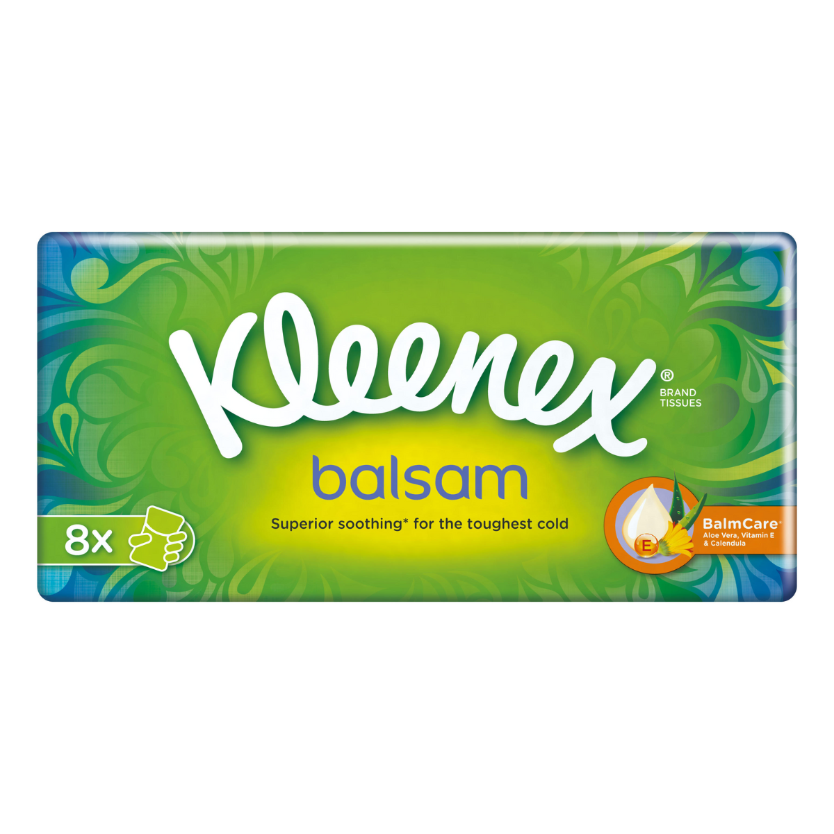 Kleenex® Balsam tissues contain Aloe Vera, Vitamin E and Calendula and leave behind a protective balm that helps to soothe your nose.