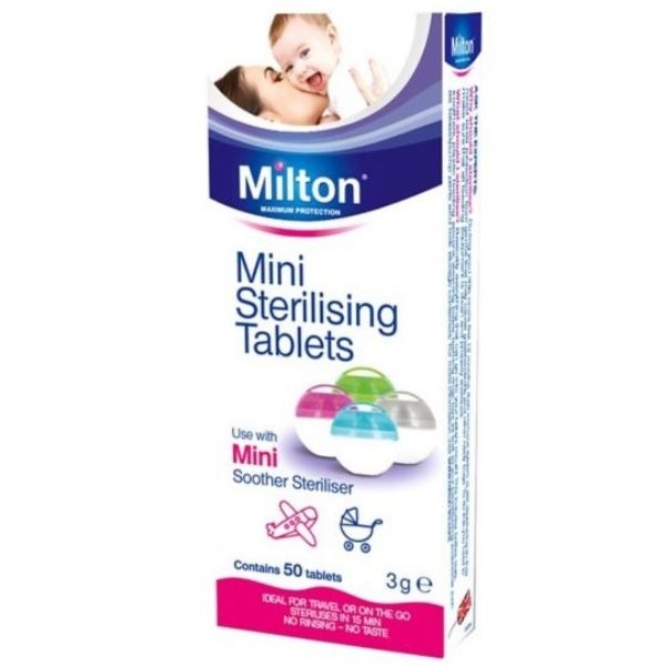 A pack of 50 safe and economical, special formula mini sterilising tablets from Milton designed for use with the Milton Mini Soother Steriliser. Please see copy for Mini Soother steriliser. PLUS: Why should I sterilise? During your little one's first 12 months, their immune systme is still developing so they need extra protection from germs that may cause gastroenteritis and other nasty bugs. To do this you need to make sure that all feeding equipment and anything that goes into your baby's mouth is sterilised.